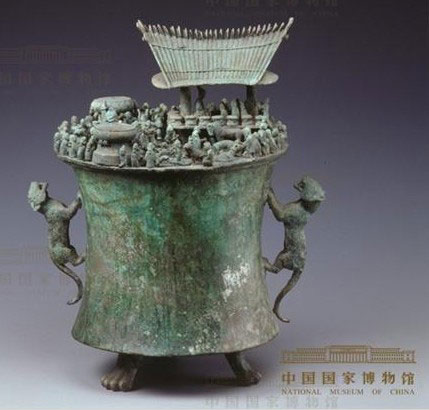 有一件貯貝器表現的是殺人祭祀的詛盟場面:廣場上陳列著大銅鼓,人頭洶涌,作為祭祀的奴隸被捆住,在柱子上盤繞的巨蛇即將吞噬他,神氣活現的女奴隸主坐在轎子上已經駕臨,祭祀即將開始。