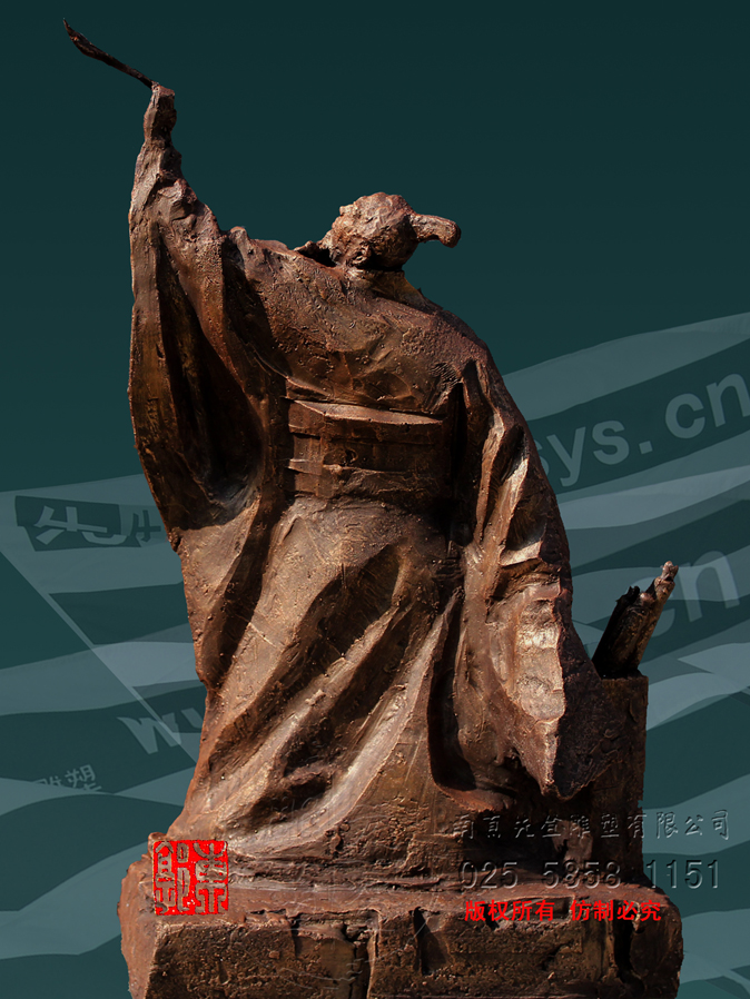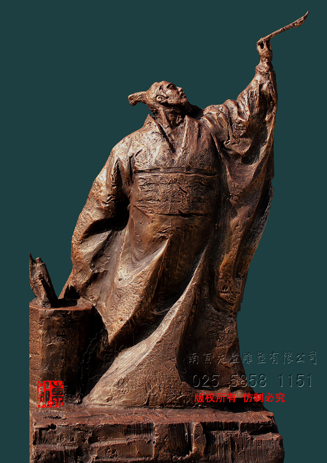 雕塑作有與無,寫色表現空,以物質的有表現無與息,是有“天風浪浪,海山蒼蒼。真力彌滿,萬象在旁”。雕塑里頭,人物形體概況詳實,清癯的面容,碩長的身姿,著一襲衣衫浮動,自是風清日里吞吐大荒,真境逼而神境生,滿目里卻皆是山蒼木秀,水活石潤,大自然的生息。再者看張芝揚手舉面,凌空中書寫,筆在而帛錦無,筆墨有無間,取大自然造化,吸盡西江,一筆當空書長卷。寫盡的是人事浮華,寫山河秀麗,寫日居月諸,寫去到日月山川里。寫盡了生命的飛揚與物的安定。